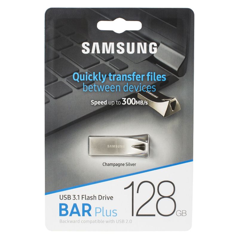Samsung Bar Plus - это накопитель нового поколения, который вы будете использовать ежедневно благодаря его впечатляющей скорости и эффектному дизайну. Он комфортно лежит в руке, его металлический корпус - это воплощение минимализма в накопителе, в котором гармонично сочетаются стиль, скорость и долговечность. Высокая скорость чтения данных до 300 Мб/сек. в сочетании с новейшим интерфейсом USB 3.1 освободит вам больше времени для работы, игры, просмотра видео и творчества. Скопируйте 3ГБ 4K UHD файл видео с вашего накопителя Bar Plus на ПК всего за 10 секунд. Прочный металлический корпус обеспечит неприкосновенность и безопасность ваших данных, а встроенное ушко для шнурка предотвратит накопитель от случайной потери. Накопитель Samsung Bar Plus - идеальное сочетание великолепного дизайна и надежности. Технические характеристики