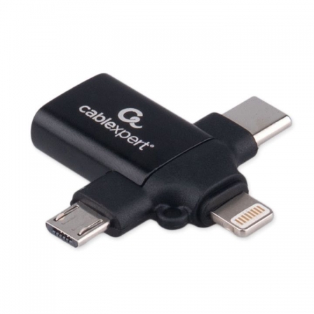 Производитель: Cablexpert Наименование: Адаптер USB OTG Интерфейс: USB 3.1 Скорость передачи данных: до 5 Гбит/с (Type C) Максимальный ток: 1 A Разъемы: USB Af - Micro USB Bm + Type Cm + Lightning Цвет: Черный