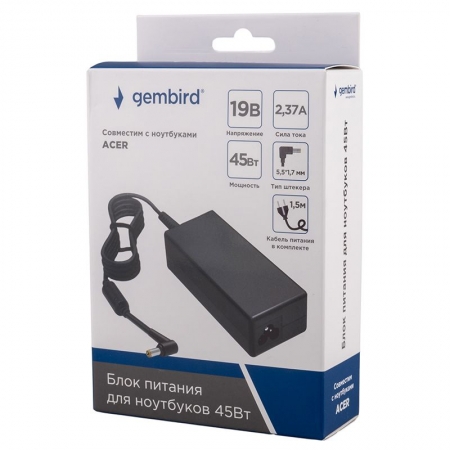 Производитель: Gembird Наименование: Блок питания для ноутбука Совместимость: Acer Входное напряжение: 100 - 240 В , 50 / 60 Гц Выходное напряжение: 19 В Выходная мощность: 45 Вт Сила тока: 2.37 А Макс. Дополнительно: Защита от короткого замыкания, перегрева, перенапряжения и перегрузки Штекер: 5.5х1.7 мм (угловой) Длина кабеля: 1.5 м (C5) + 1.4 м (встроенный) Материал корпуса: Пластик Цвет: Черный