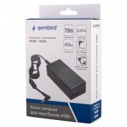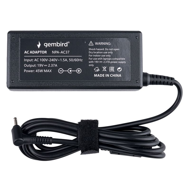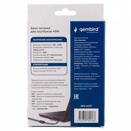 Производитель: Gembird Наименование: Блок питания для ноутбука Совместимость: ACER, ASUS Входное напряжение: 100 - 240 В , 50 / 60 Гц Выходное напряжение: 19 В Выходная мощность: 45 Вт Сила тока: 2.37 А Макс. Дополнительно: Защита от короткого замыкания, перегрева, перенапряжения и перегрузки Штекер: 3х1.1 мм (угловой) Длина кабеля: 1.5 м (C5) + 1.4 м (встроенный) Материал корпуса: Пластик Цвет: Черный