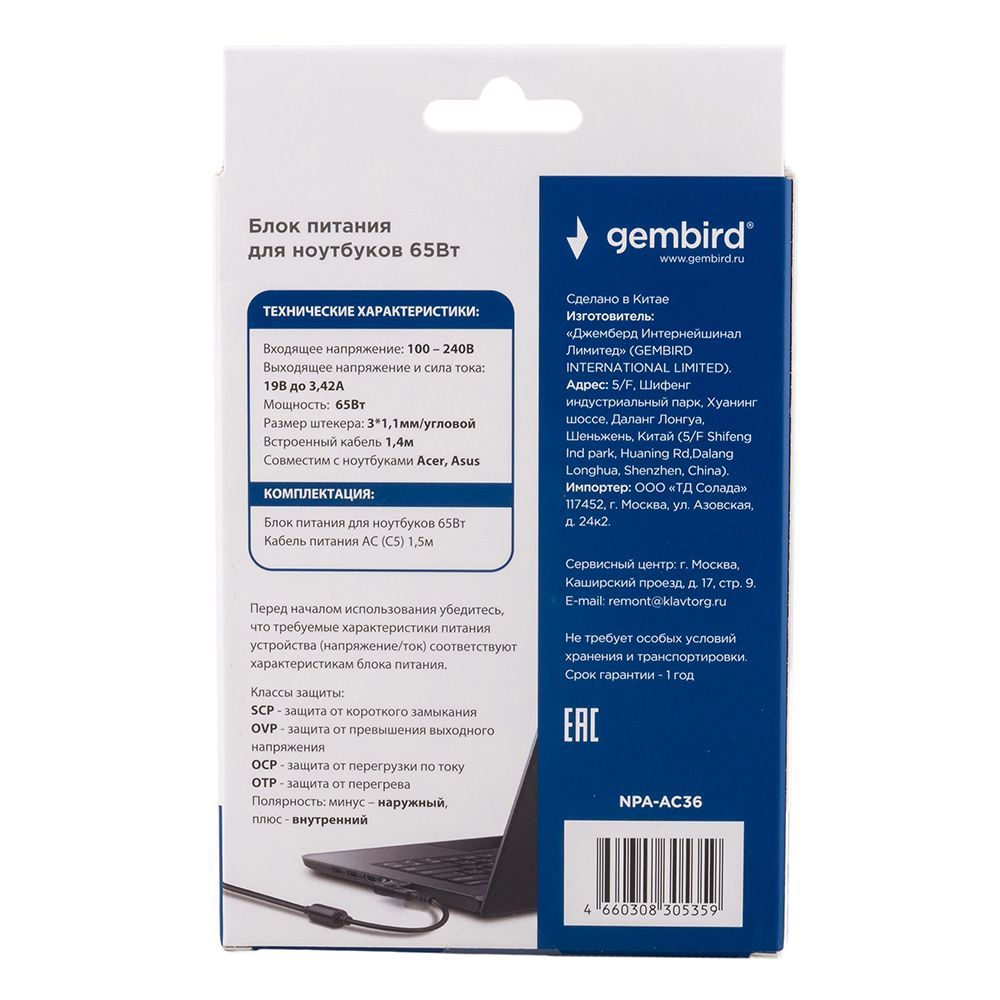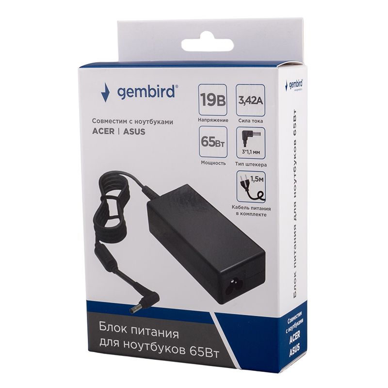 Производитель: Gembird Наименование: Блок питания для ноутбука Совместимость: ACER, ASUS Входное напряжение: 100 - 240 В , 50 / 60 Гц Выходное напряжение: 19 В Выходная мощность: 65 Вт Сила тока: 3.42 А Макс. Дополнительно: Защита от короткого замыкания, перегрева, перенапряжения и перегрузки Штекер: 3х1.1мм (угловой) Длина кабеля: 1.5 м (C5) + 1.4 м (встроенный) Материал корпуса: Пластик Цвет: Черный