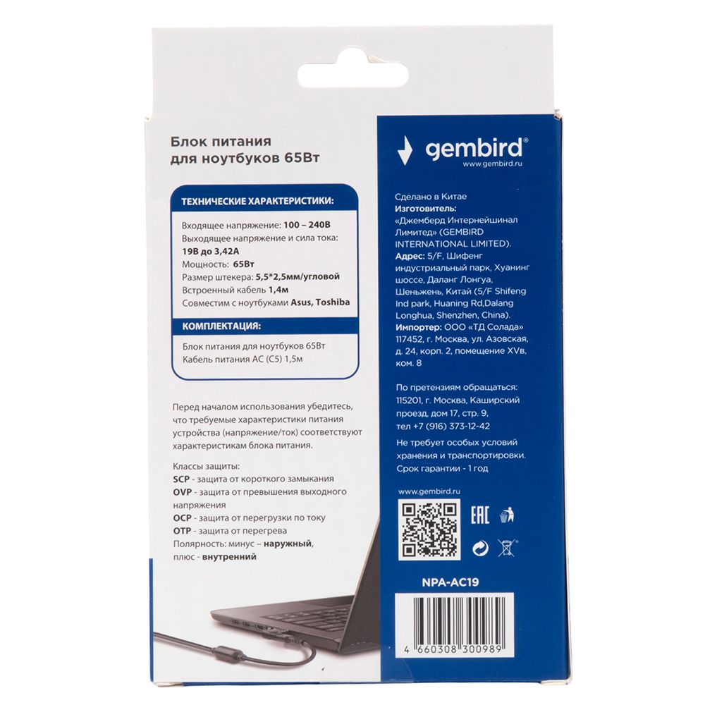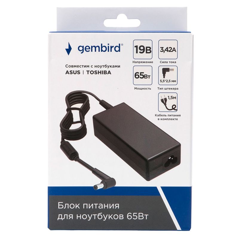 Производитель: Gembird Наименование: Блок питания для ноутбука Совместимость: Asus, Toshiba Входное напряжение: 100 - 240 В , 50 / 60 Гц Выходное напряжение: 19 В Выходная мощность: 65 Вт Сила тока: 3.42 А Макс. Дополнительно: Защита от короткого замыкания, перегрева, перенапряжения и перегрузки Штекер: 5.5х2.5 мм (угловой) Длина кабеля: 1.5 м (C5) + 1.4 м (встроенный) Материал корпуса: Пластик Цвет: Черный