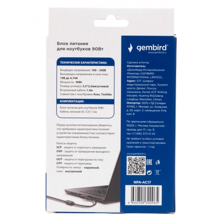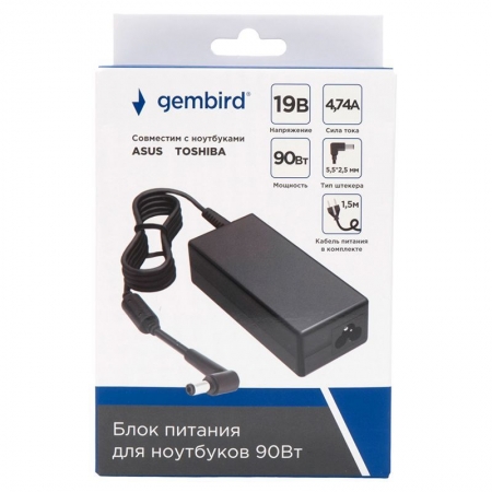 Адаптер питания для ноутбука Asus, Toshiba, 19В/4.74А, 90Вт, штекер 5.5х2.5мм, Gembird NPA-AC17