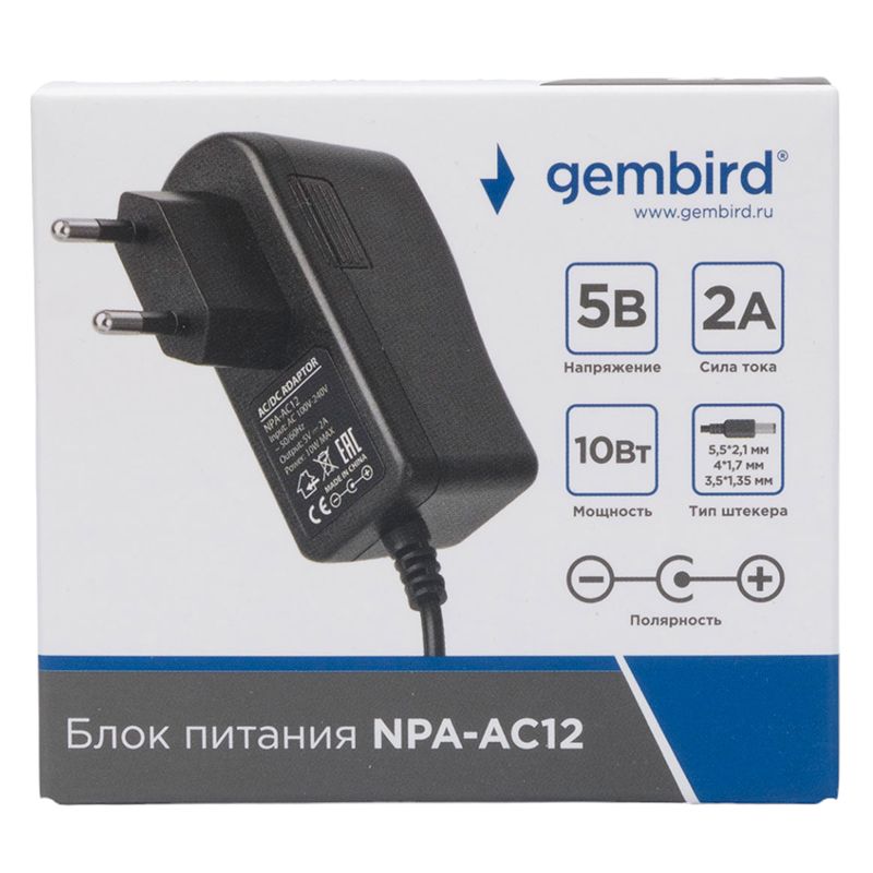 Сетевой адаптер питания Gembird NPA-AC12 подойдет для различной техники: тонометров, роутеров, ТВ-приставок, сигнализаций, электробритв, радиоприемников, видеокамер, а также для других устройств с входным напряжением 5 В и максимальной потребляемой мощностью 10 Вт. Имеет защиту от короткого замыкания, превышения выходного напряжения, перегрузки по току, перегрева. Блок питания оснащен встроенным кабелем длиной 1 метр, штекером 5,5x2,1 мм и двумя переходниками 4x1,7 мм и 3,5x1,35 мм.