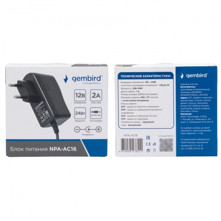 Производитель: Gembird Наименование: Адаптер питания Входящее напряжение: 100 - 240 В Выходящее напряжение: 12 В Сила тока: до 2 А Максимальная мощность: 24 Вт Размер штекера: 5.5х2.1 мм Защита от короткого замыкания: есть Защита от превышения выходного напряжения: есть Защита от перегрузки по току: есть Защита от перегрева: есть Полярность: минус - наружный, плюс - внутренний Длина кабеля: 1 м Цвет: Чёрный Вес: 120 г