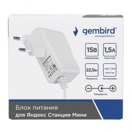 Производитель: Gembird Наименование: Адаптер питания Совместимость: Яндекс станции Мини (YNDX 00020/YNDX 00021) Входящее напряжение: 100 - 240 В Выходящее напряжение: 15 В Сила тока: до 1.5 А Максимальная мощность: 22.5 Вт Размер штекера: 4x1,7 мм Полярность: минус - наружный, плюс - внутренний Длина кабеля: 1.8 м Цвет: Белый Вес: 95 г