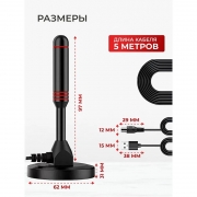 Производитель: Selenga Наименование: Антенна комнатная для ТВ Тип антенны: Активная Диапазон частот: 174 - 240 МГц, 470 - 862 МГц Поддержка стандартов: DVB-T/DVB-T2 Коэффициент усиления: 25 дБи Волновое сопротивление: 75 Ом Усилитель сигнала: Есть Поддержка 1080p, 4K Питание: USB 5 В Длина кабеля: 5 м Разъем: F-штекер + переходник на TV Цвет: Чёрный