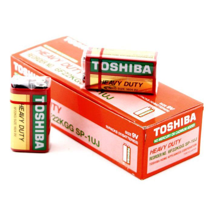 Toshiba 6F22 - солевые батарейки размера 9V "крона", они используются в устройствах с низким или средним энергопотреблением, таких как часы, пульты дистанционного управления, радиоприемники, карманные фонари и др. Отличаются длительным сроком хранения. Не содержат ртути и кадмия. Цена указана за 10 батареек. Технические характеристики