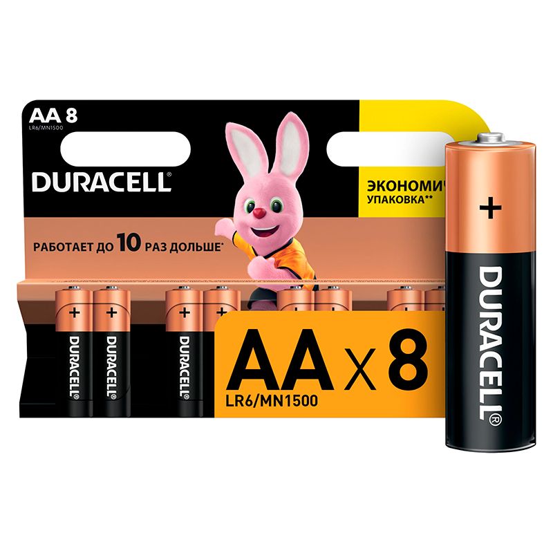 Производитель: Duracell Наименование: Элемент питания Размер: AA (LR6) Химический состав: Щелочной Номинальное напряжение: 1.5 В Упаковка: Блистер Количество: 8 шт