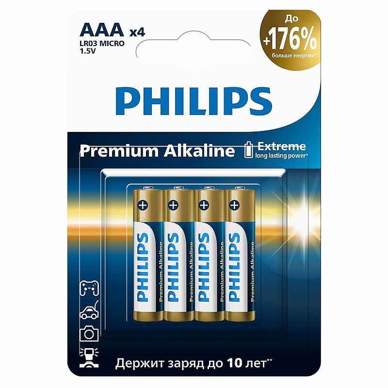 Производитель: Philips Наименование: Элемент питания Размер: AAA (LR03) Химический состав: Щелочной Напряжение питания: 1.5 В Упаковка: Блистер Количество: 4 шт