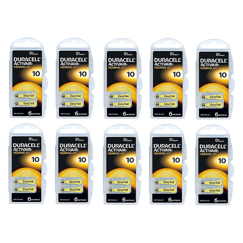 Duracell ActivAir 10 - долговечные батарейки без ртути для слуховых аппаратов. Изготовлены с применением специальной технологии, защищающей батарейки от протекания. Цена указана за 60 батареек (10 блистеров по 6 батареек).