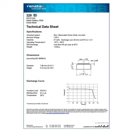 Производитель: Renata Наименование: Элемент питания Типоразмер: 329 / SR731SW Химический состав: Серебряно-оксидная Номинальное напряжение: 1,55 В Номинальная ёмкость: 37 мАч Размеры: 7.9 х 3.1 мм Вес: 0.58 г (1 батарейка) Упаковка: Коробка, индивидуально упакованы по 1 шт Количество: 10 шт