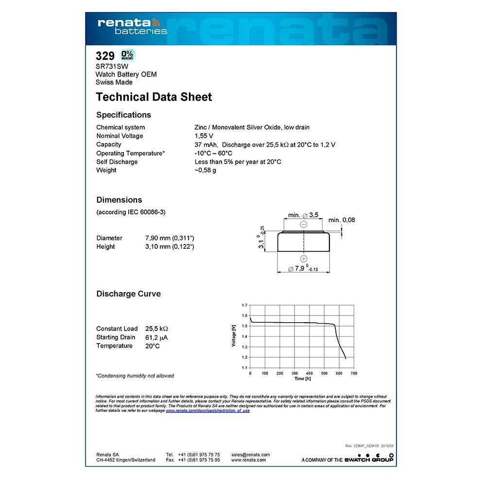 Серебряно-оксидные батарейки Renata 329 (SR731SW) используются в часах и других электронных устройствах. Отличаются высоким качеством и надежностью. Цена указана за 10 батареек.