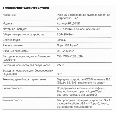 Производитель: Perfeo Наименование: Беспроводное зарядное устройство Qi Совместимость: Устройства с поддержкой Qi-технологии Входное напряжение: 9В/2А, 5В/3А Выходная мощность: для мобильного телефона: 15Вт/10Вт/7,5Вт/5Вт; для беспроводных наушников: 3Вт; для смарт часов 2,5Вт Питание: от блока питания QC 3.0 18 Вт (приобретается отдельно) Защита: от высокого напряжения, от короткого замыкания, от перегрузки по току Функции: LED-подсветка Материал корпуса: ABS-пластик + закаленное стекло Разъемы: Type-C Цвет: Чёрный Размеры: 204 х 80 х 8 мм