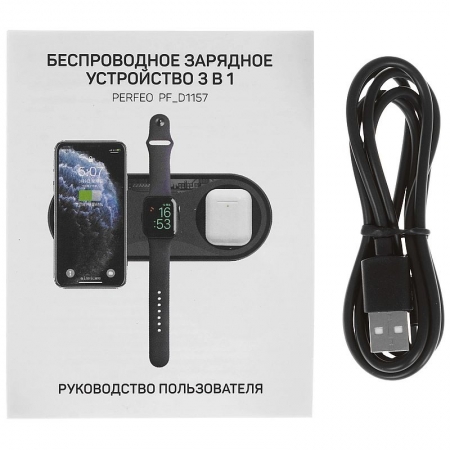 Беспроводное зарядное устройство 3 в 1 для iPhone и Android с поддержкой технологии беспроводной зарядки QI. Это устройство идеально подходит для зарядки сразу трех устройств: вашего телефона, наушников и часов. Оно обладает функцией беспроводной зарядки, что позволяет избавиться от лишних проводов на вашем столе и создать более комфортную обстановку. Зарядное устройство имеет разъем Type C, что облегчает его подключение к различным устройствам. Встроенная защита от замыкания гарантирует безопасность ваших устройств. В комплект кабель USB Type C длиной 1 метр. Внимание! Не все телефоны