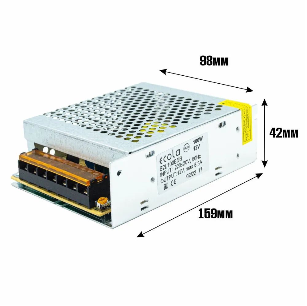 Производитель: Ecola Наименование: Блок питания (драйвер) для светодиодной ленты Входное напряжение: AC 200-240 В 50/60 Гц Выходное напряжение: DC 12 В Макс. мощность: 100 Вт Макс. выходной ток: 8.3А Степень защиты: IP20 Материал корпуса: Металл Размеры: 159x98x42 мм Упаковка: Коробка