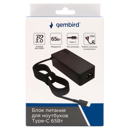 Производитель: Gembird Наименование: Блок питания Входное напряжение: 100-240В Выходное напряжение: 5 В / 3 A, 9 В / 3 A, 12 В / 3 A, 15 В / 3 A, 20 В / 3.25 A Максимальная выходная мощность: 65 Вт Поддержка быстрой зарядки: PD 3.0/PD2.0/PD Разъем питания: кабель Type C Защита: от короткого замыкания, от превышения выходного напряжения, от перегрузки по току, от перегрева Длина кабеля: 1.4 м (встроенный) + 1.5 м (съемный) Материал корпуса: ABS-пластик Цвет: Чёрный