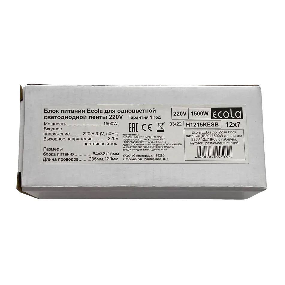 Блок питания (вилка с проводом) для LED ленты 220V 14x7 1500 Вт, Ecola (H1415KESB)