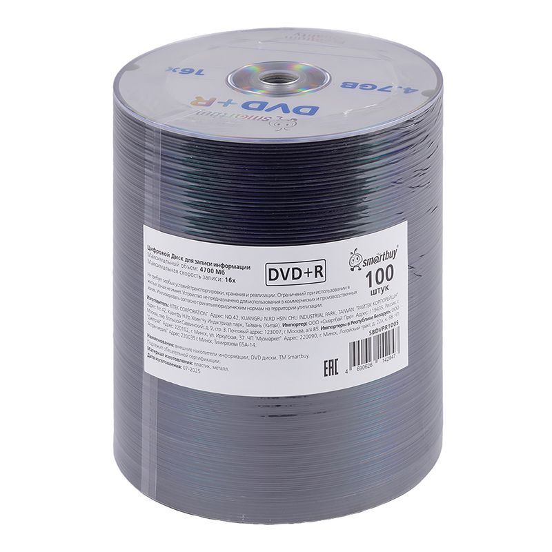 Оптический записываемый диск DVD+R Smartbuy 4.7Gb 16x, в упаковке 100 шт. Цена указана за упаковку.