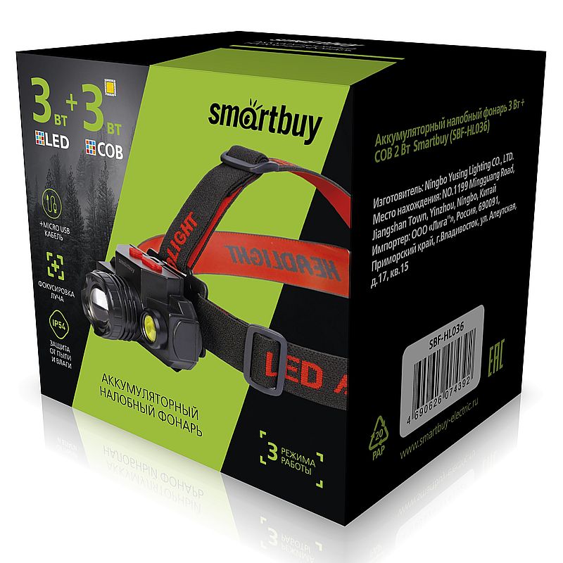 Налобный фонарь SmartBuy SBF-HL036 является идеальным решением для любителей пешего туризма, альпинизма и походов за грибами. Устройство оснащено 1 светодиодом CREE XPE повышенной мощности 3 Вт и светодиодом COB мощностью 3 Вт, обеспечивающими яркое освещение. Имеет 3 режима работы: дальний свет, COB, дальний свет + COB. Доп. функции: фокусировка луча. Работает от Li-ion аккумулятора 1x18650 1500 мАч. В комплекте кабель Micro USB для подзарядки. Технические характеристики