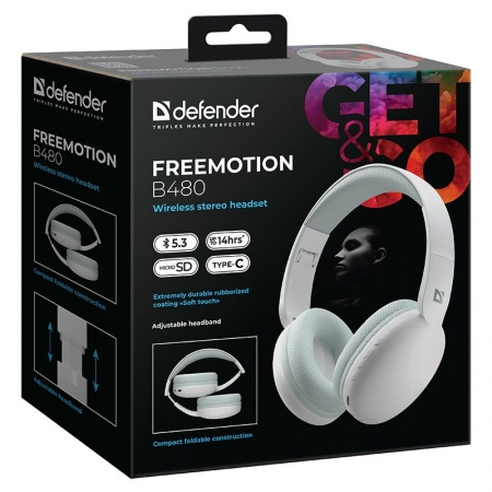 Defender FreeMotion B480 - легкая и удобная беспроводная гарнитура с приятным покрытием «Soft Touch» и хорошим звуком. Наличие Bluetooth интерфейса и встроенный микрофон позволяют общаться по телефону или слушать интернет-радио с ноутбука, свободно перемещаясь по комнате. Слот для карты памяти стандарта Micro SD превращает наушники в MP3-плеер - слушайте музыку, не подключаясь к смартфону или ноутбуку. Регулируемое оголовье дает возможность подобрать наиболее удобную посадку. Клавиши управления на наушниках позволят ответить на звонок либо переключить композицию, не доставая телефон из сумки. Благодаря складной конструкции наушники удобны для хранения и транспортировки. Источником питания служит встроенный аккумулятор, обеспечивающий до 14 часов автономной работы, а если он разрядится, гарнитуру можно подключить с помощью стандартного 3.5 мм АUX-кабеля.