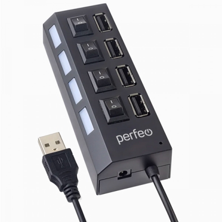 USB-разветвитель Perfeo PF-H030 предназначен для подключения дополнительных устройств к компьютеру. Модель оснащена 4 портами USB 2.0 и индивидуальными выключателями со световой индикации для каждого порта. Поддерживает скорость передачи данных до 480 Мбит/сек. Питается концентратор от USB-порта, а для подключения энергоемких устройств или зарядки мобильной техники в нем имеется разъем для внешнего блока питания. Встроенный USB-кабель имеет длину 45 см, что делает его удобным для использования с ноутбуком.