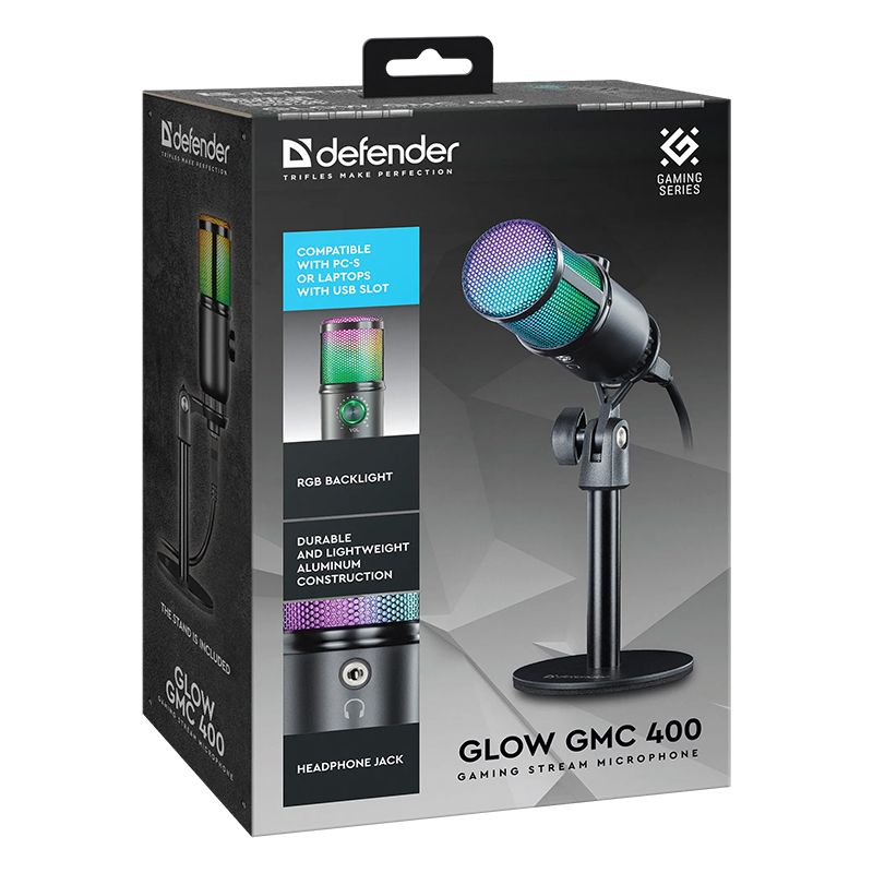 Defender Glow GMC 400 - игровой стрим микрофон с RGB подсветкой оптимален для стриминга, подкастов и онлайн игр. Совместим с любыми ПК и ноутбуками с USB-разъемом. Штатив в комплекте.