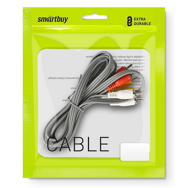 Аудио-видео кабель SmartBuy предназначен для подключения различных мультимедийных устройств, таких как телевизор, видеомагнитофон, DVD-плеер, оснащенных разъемами RCA.