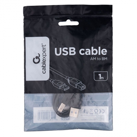 Производитель: Cablexpert Наименование: USB-кабель Разъемы: USB AM - BM Интерфейс: USB 2.0 Скорость передачи данных: до 480 Мбит/сек Максимальный ток: 2.4 А Материал проводников: Медь Экранирование: Двойное (фольга + сетка) Длина кабеля: 1 м Цвет: Черный
