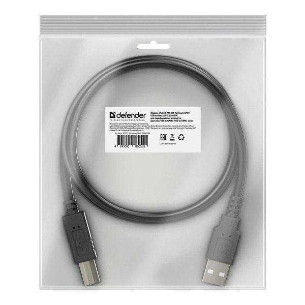 Производитель: Defender Наименование: Кабель USB для подключения периферийных устройств Разъемы: USB A (m) - B (m) Интерфейс: USB 2.0 Пропускная способность: До 480 Мбит/сек Длина кабеля: 1.8 м Цвет: Черный Упаковка: Пакет