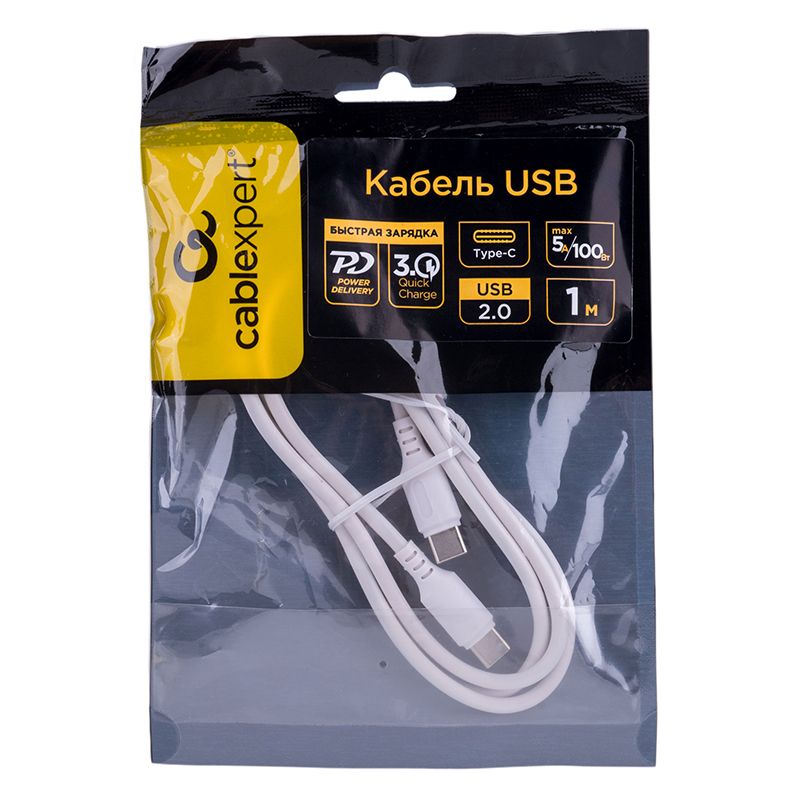 Производитель: Cablexpert Наименование: USB-кабель Предназначение: Синхронизация, передача данных, подзарядка Интерфейс: USB 2.0 Пропускная способность интерфейса: до 480 Мбит/сек Максимальный ток: 5 А Максимальная мощность: 100 Вт Поддержка быстрой зарядки: PD / QC3.0 Разъемы: 2 x Type C (m) Материал проводников: Медь Толщина жил (передача данных / питание): 30 / 20 AWG Оболочка кабеля: Силикон Длина кабеля: 1 м Цвет: Белый