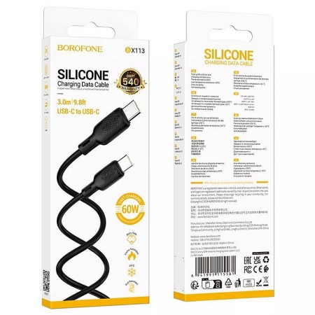 Кабель USB 2.0 Type C M-M - 3 м, 60Вт, 3A, PD/QC3.0, черный, силикон, Borofone BX113