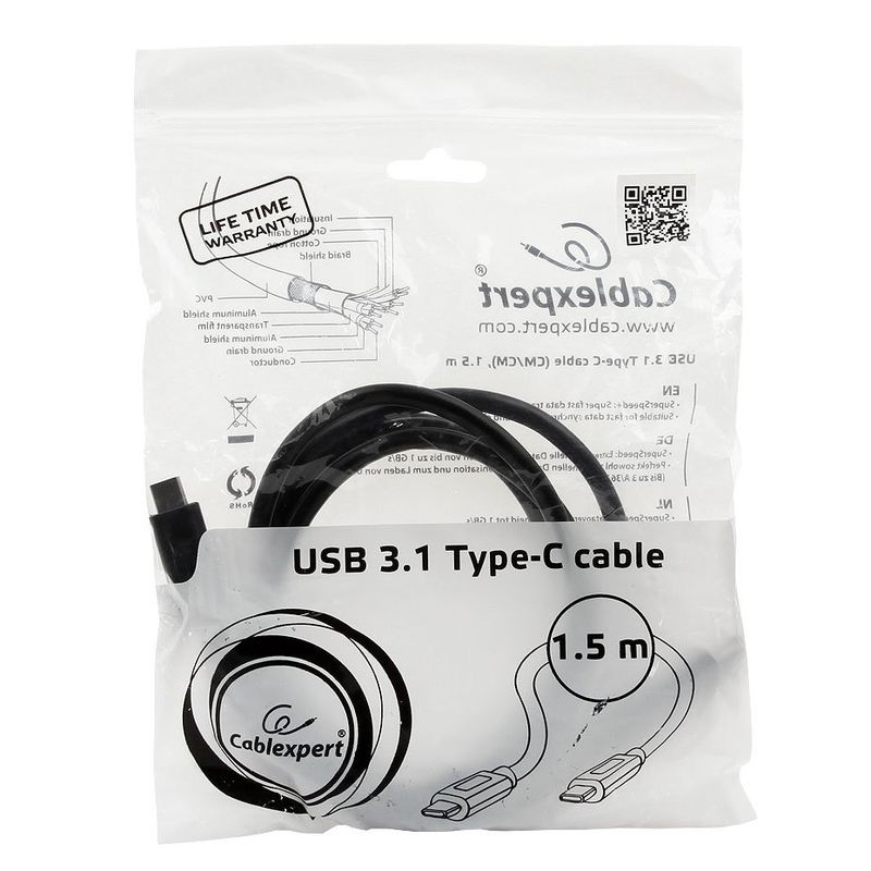 Кабель USB 3.1 Type C M-M, 1.5 м, PD/QC3.0 36 Вт, черный, Cablexpert (CCP-USB3.1-CMCM-5)