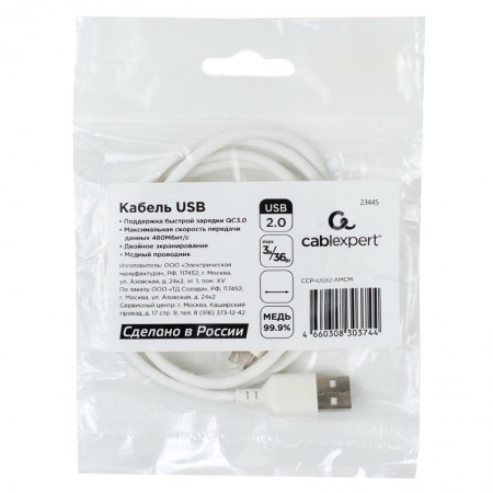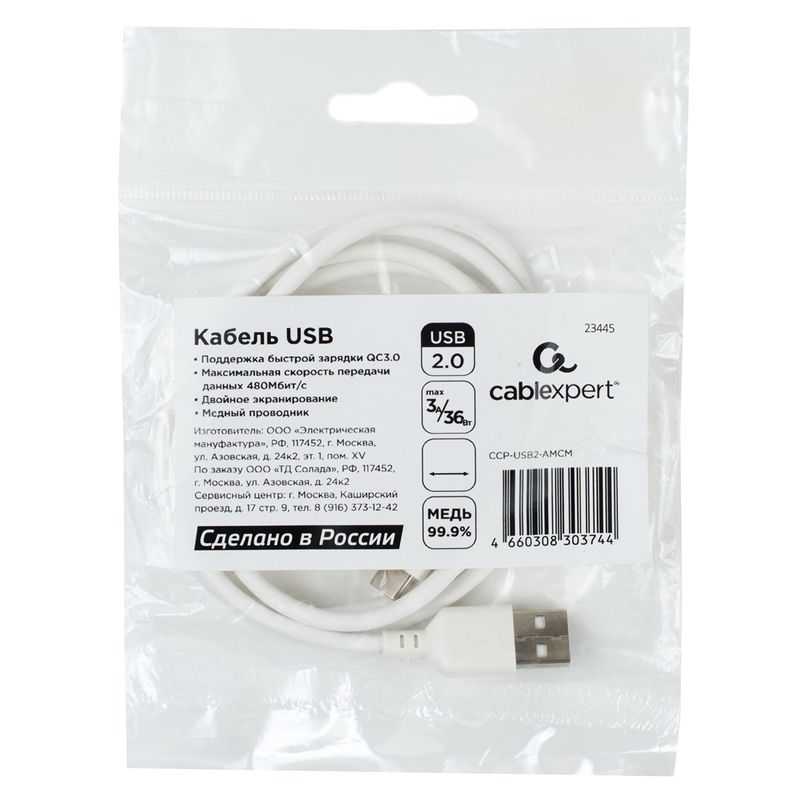 Кабель USB 3.1 Type C(m) - USB 2.0 Am - 1.8 м, 36 Вт, белый, Cablexpert (CCP-USB2-AMCM-1.8M-RU-W)