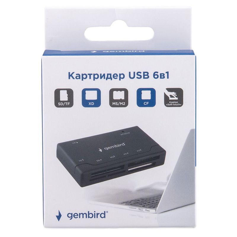 Мультиформатный картридер 6в1 Gembird FD2-MSD-4 предназначен для чтения/записи карт памяти SD, microSD, MS, M2, CF, xD. Поддерживает интерфейс USB 2.0, обеспечивающий скорость передачи данных до 480 Мбит/сек. Для установки не требуются дополнительные драйвера. В комплекте кабель USB/MiniUSB длиной 50 см. Технические характеристики