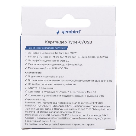 Компактный картридер Gembird FD2-MSD-6 предназначен для чтения/записи карт памяти SD и microSD до 512 Гб. Он оснащен разъемами USB A и USB C, что позволяет легко переносить файлы между различными устройствами. Картридер идеально подходит для копирования файлов и фотографий на карту памяти вашего телефона, фотокамеры и другой цифровой техники. Совместим с мобильными устройствами, камерами, видеорегистраторами, системами наблюдения и другим оборудованием. Поддерживает интерфейс USB 2.0, обеспечивающий скорость передачи данных до 480 Мбит/сек. Корпус устройства выполнен из алюминия.