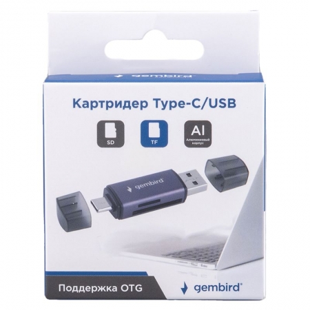 Производитель: Gembird Наименование: Внешний картридер Поддержка карт памяти: MicroSD, MicroSDHC, MicroSDXC; SD (до 512 Гб) Интерфейс: USB 2.0 Скорость передачи данных: до 480 Мбит/сек Разъемы: USB A, USB C Поддержка OTG: Да Материал корпуса: Алюминий