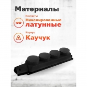 Колодка каучуковая с 4 розетками с заземляющими контактами. Максимальная подключаемся нагрузка - 3500 Вт. Разъемы имеют степень пылевлагозащиты IP44. Штифты и токоведущие элементы внутри корпуса вилки зафиксированы в термостойком негорючем пластике. Все вилки оснащены прижимными планками для фиксации провода. Крепежные элементы контактных групп штепсельных розеток позволяют подключать провод с сечением от 0,5 мм2 до 2,5 мм2. Благодаря наличию на корпусе крепежных отверстий, изделие можно закрепить на вертикальной поверхности. Колодку можно использовать в качестве блока розеток для открытой установки внутри бытовых и производственных помещений или для производства удлинителей. Технические характеристики
