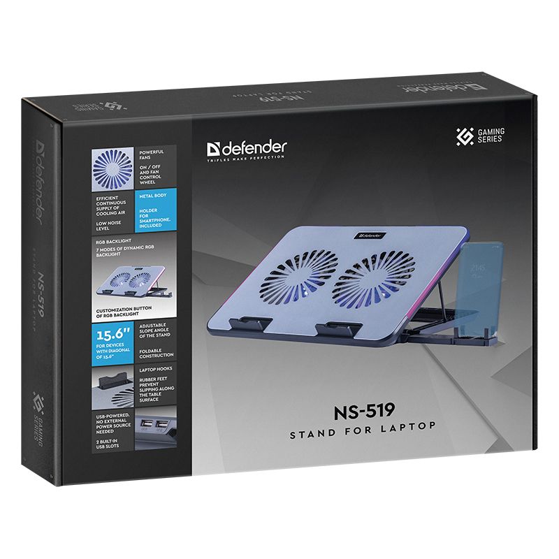 Defender NS-519 - минималистичный дизайн. Мощные вентиляторы. RGB подсветка. Идеальная подставка для ноутбука для работы дома или в офисе. Подойдет также для длительных игр на любимом ноутбуке.