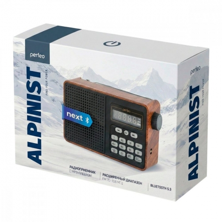 Perfeo "Alpinist Next" - портативный радиоприёмник с расширенным диапазоном FM (70-108 МГц), встроенным MP3 плеером и модулем Bluetooth. Радиоприемник в классическом корпусе имеет стильный внешний вид, удобное колесико-регулятор громкости и кнопки управления. Также в нем предусмотрен выход для наушников 3.5 мм. Поворотная телескопическая антенна принимает сигнал в 2-х самых популярных диапазонах (УКВ и FM), есть возможность выборочного запоминания до 60 станций. Встроенный MP3-плеер воспроизводит MP3-файлы с карты памяти microSD или USB-накопителя. За насыщенное звучание приемника и создание эффекта глубины звуковой сцены отвечает 50 мм динамик (RMS 5 Вт) и пассивный сабвуфер Bass Booster. Автономная работа осуществляется от сменного аккумулятора 18650 (1200 мАч), зарядка от USB-порта (кабель USB Type-C - USB в комплекте).