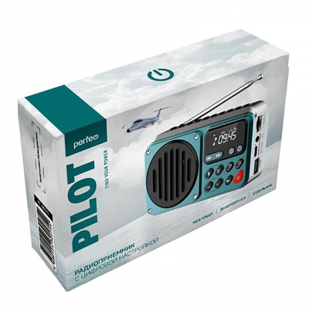 Perfeo "Pilot" - портативный радиоприёмник с FM-диапазоном (87.5-108 МГц), встроенным MP3 плеером и модулем Bluetooth. Радиоприемник выполнен в стильном корпусе, имеет удобное колесико-регулятор громкости и кнопки управления. Также в нем предусмотрен выход для наушников 3.5 мм. Поворотная телескопическая антенна обеспечивает уверенный прием станций в FM-диапазоне. В приемнике есть память на 60 станций, будильник, функция записи эфира и выключение по времени. Встроенный MP3-плеер воспроизводит MP3-файлы с карты памяти microSD или USB-накопителя. Питается устройство от трёх сменных аккумуляторов 14500 (500 мАч) или USB-порта (кабель USB Type-C и аккумуляторы входят в комплект).