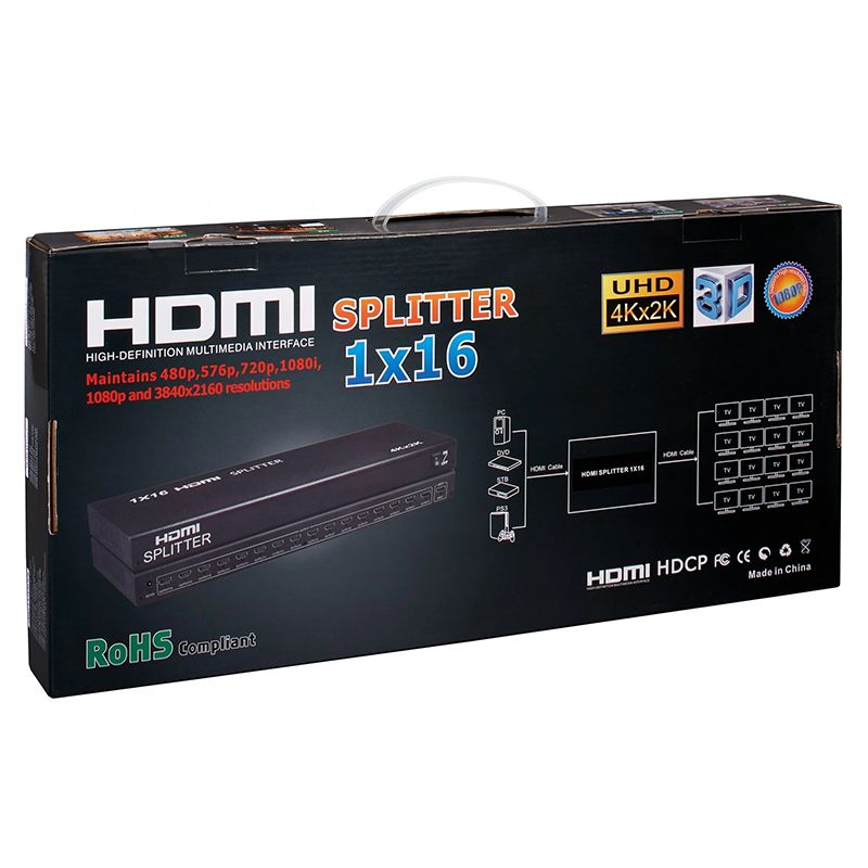 Производитель: Telecom Наименование: Разветвитель HDMI сигнала Порты: 1 вход HDMI, 16 выходов HDMI, 19 pin (A) Спецификация: HDMI v1.4, HDCP Максимальное разрешение: 4K/30 Гц Поддержка 3D: Есть Индикация: Питание, индикатор активности для каждого порта Питание: от БП DC 5В 2 А Материал корпуса: Металл Цвет: Черный
