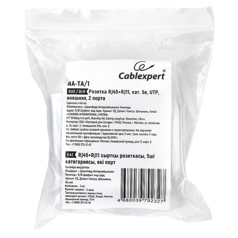 Производитель: Cablexpert Наименование: Накладная розетка Количество портов: 2 Разъемы: 8P8C (RJ-45) и 6p4c (RJ-11) Категория: 5е Тип контактов: 110&Krone Тип витой пары: Одножильная или многожильная UTP 5e Вид крепежа: Настенный при помощи шурупов или клейкой двусторонней площадки (в комплекте поставки) Материал корпуса: Пластик