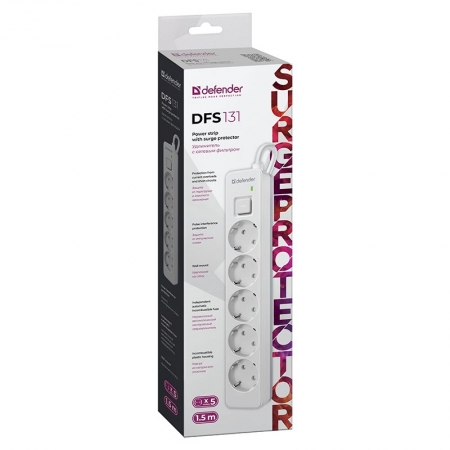 Сетевой фильтр Defender DFS 131 - удобный способ организации питания и защиты подключаемого оборудования. Модель оснащена пятью евророзетками с защитными шторками и заземляющими контактами, автоматическим предохранителем и выключателем со световой индикацией. Фильтр обеспечивает защиту от короткого замыкания, импульсных помех и превышения токовой нагрузки. Корпус сетевого фильтра выполнен из негорючего пластика и имеет отверстия для крепления на стену. Максимальная нагрузка 3.68 кВт, длина шнура 1.5 метра.