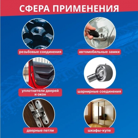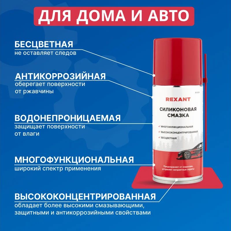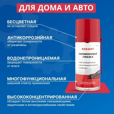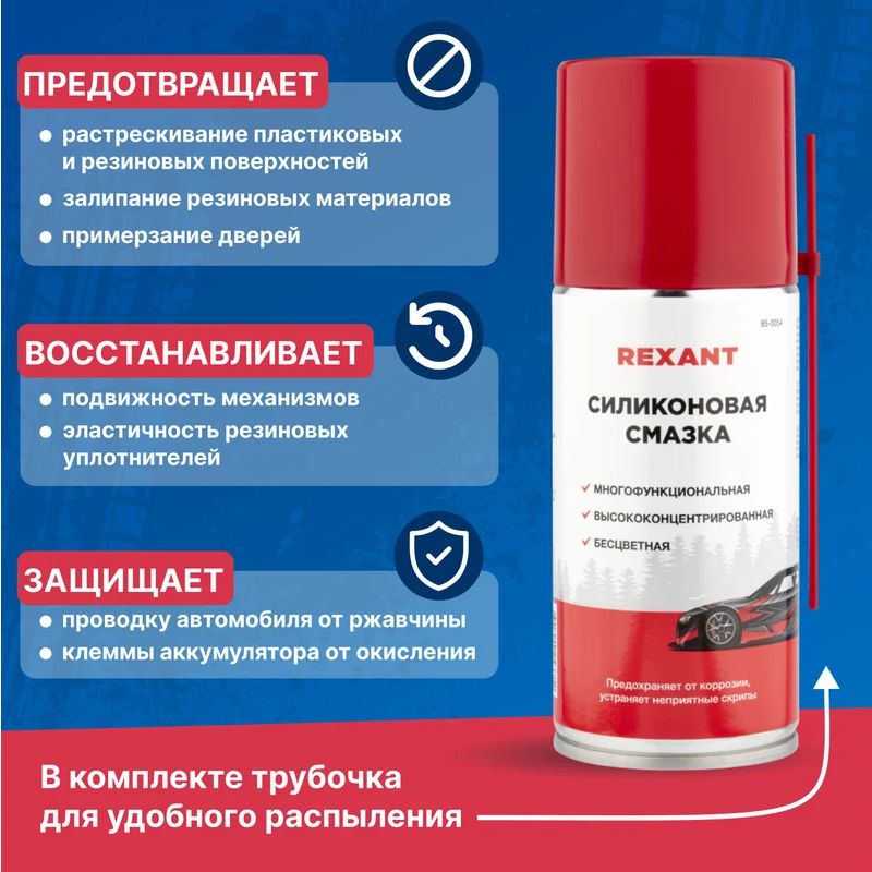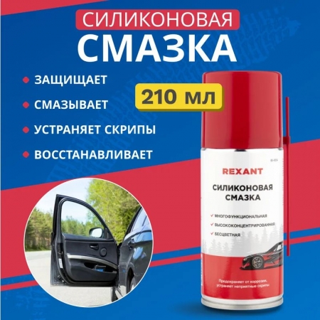 Силиконовая смазка Rexant - профессиональная концентрированная смазка для ухода за механическими соединениями в автомобиле (замки и петли дверей, капота, багажника, стеклоподъемники, тросы, личинки замков, приводы и направляющие). Незаменимое средство для обслуживания промышленного оборудования. Помогает избежать примерзания и растрескивания резиновых уплотнений дверей, багажника, капота в условиях отрицательных температур. Продлевает срок службы резиновых уплотнителей. Защищает систему зажигания от проникновения влаги и утечки тока. Защищает металлические соединения от коррозии, устраняет неприятные скрипы и прикипание деталей. Профессиональная формула смазки содержит концентрированную смесь силиконовых полимеров, которые образуют на поверхности тонкую пленку с высокими смазывающими и водоотталкивающими свойствами в широком интервале температур (от -40 до +170 °С). Смазка способна оставаться на поверхности после многочисленных моек и при частом перепаде температур. Легко наносится благодаря аэрозольному распылению, экономична при нанесении. Характеристики