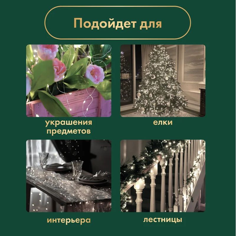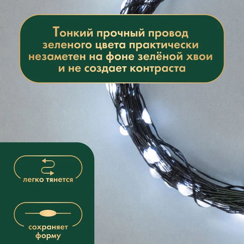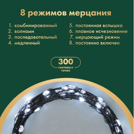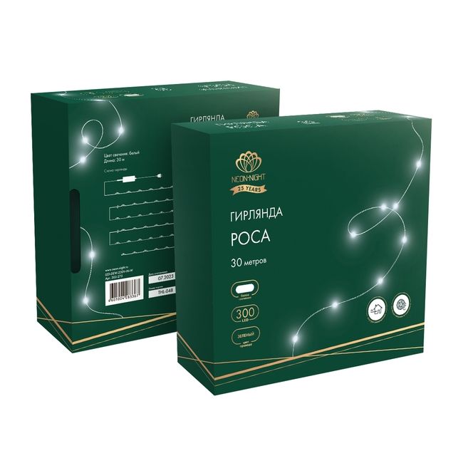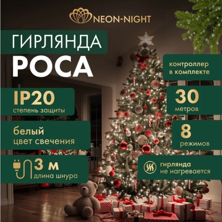 Гирлянда Neon-Night "Роса" применяется для украшения любых предметов интерьера и создания романтических образов на фотосессиях, свадьбах, днях рождениях и других праздниках. Отлично подходит для украшения новогодней елки. Гирлянда представляет собой тонкий провод зеленого цвета длиной 30 метров, на котором горят и мерцают маленькие светодиоды белого свечения, напоминающие капли росы. Она имеет 8 режимов работы (комбинированный, волнами, последовательный, медленный, постоянная вспышка, плавное исчезновение, мерцание, постоянное свечение). Гирлянда работает от сети 220 В и имеет степень защиты IP20, что делает её безопасной для использования внутри помещения. Технические характеристики