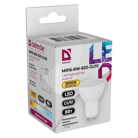 Лампочка Defender MR16 софит 8 Вт с цоколем Gu10 применяется в сети 230В и предназначена для использования в осветительных приборах наружного и внутреннего освещения. Является современным, качественным и доступным источником света. Позволяет экономить до 90% электроэнергии по сравнению с лампой накаливания с аналогичным световым потоком. Светит теплым светом - такая цветовая температура эффективна для отдыха и уютной атмосферы в доме.