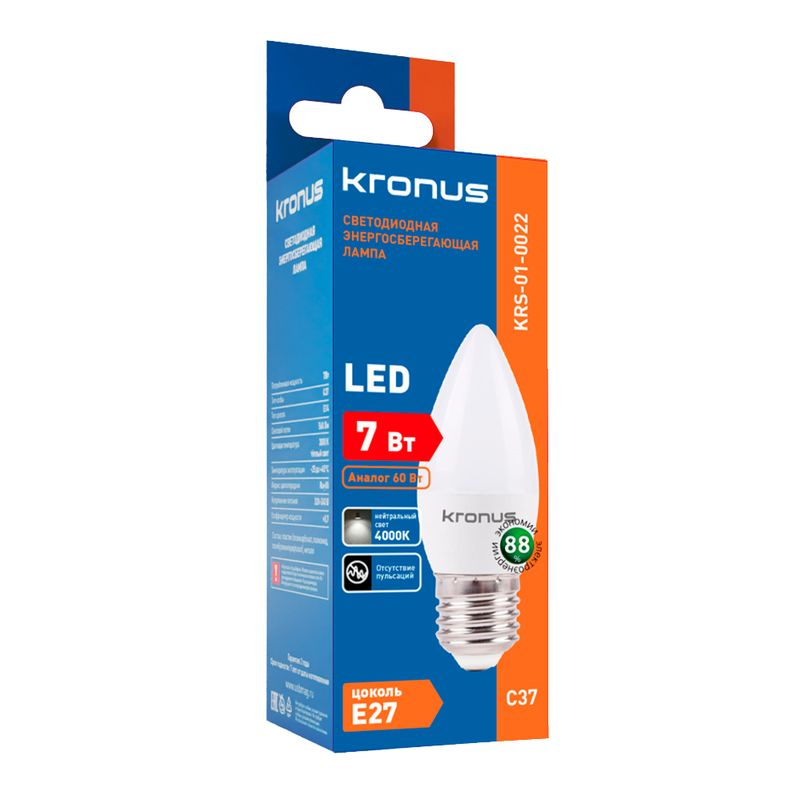 Kronus С37 - энергосберегающая светодиодная лампа общего или декоративного освещения, подходит для замены стандартных ламп накаливания и галогенных. Благодаря своей экономичности, длительному сроку службы и экологичности она выгодно отличаются от обычной лампы накаливания. Лампа С37 повторяет форму и размеры стандартных ламп типа «свеча» и идеально подходит к любому светильнику, в котором используются данные типы ламп. Колба лампы имеет матовую поверхность и оснащена цоколем E27. Хорошая цветопередача и отсутствие мерцания обеспечивают меньшую утомляемость глаз. В лампе применяется высокоэффективный драйвер с ресурсом работы до 30 000 часов. Не содержит ртути и экологически безопасна.