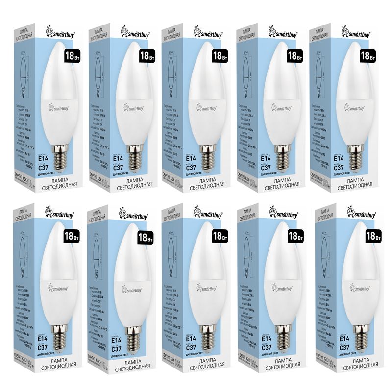 Smartbuy С37 - энергосберегающая светодиодная лампа общего или декоративного освещения, подходит для замены стандартных ламп накаливания и галогенных. Благодаря своей экономичности, длительному сроку службы и экологичности она выгодно отличаются от обычной лампы накаливания. Лампа С37 повторяет форму и размеры стандартных ламп типа «свеча» и идеально подходит к любому светильнику, в котором используются данные типы ламп. Колба лампы имеет матовую поверхность и оснащена цоколем E14. Хорошая цветопередача и отсутствие мерцания обеспечивают меньшую утомляемость глаз. В лампе применяется высокоэффективный драйвер с ресурсом работы до 30 000 часов. Не содержит ртути и экологически безопасна. Цена указана за 10 ламп. Особенности