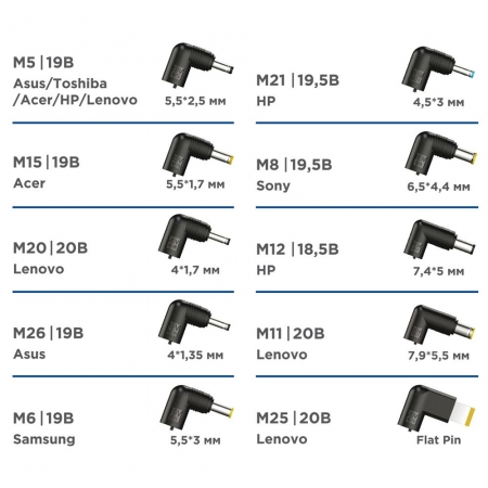 Gembird NPA-DC8 - универсальный автоматический блок питания для ноутбуков. Адаптер обладает мощностью 65 Вт и совместим с большинством моделей ноутбуков, представленных на рынке. Выберите необходимый разъем для вашего ноутбука и адаптер автоматически установит необходимое напряжение. Устройство имеет защиту от перегрузки, перегрева и короткого замыкания. В комплект входят 10 штекеров для совместимости с ноутбуками различных производителей.
